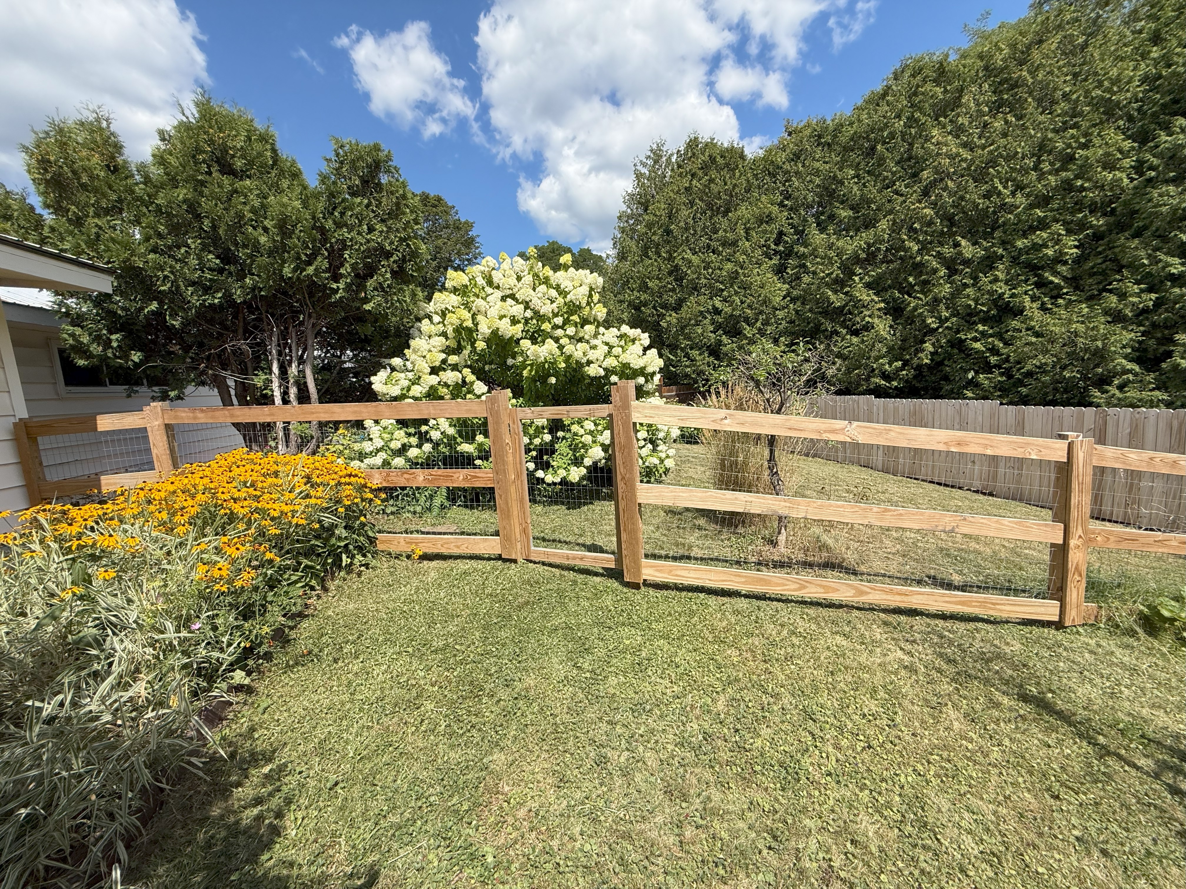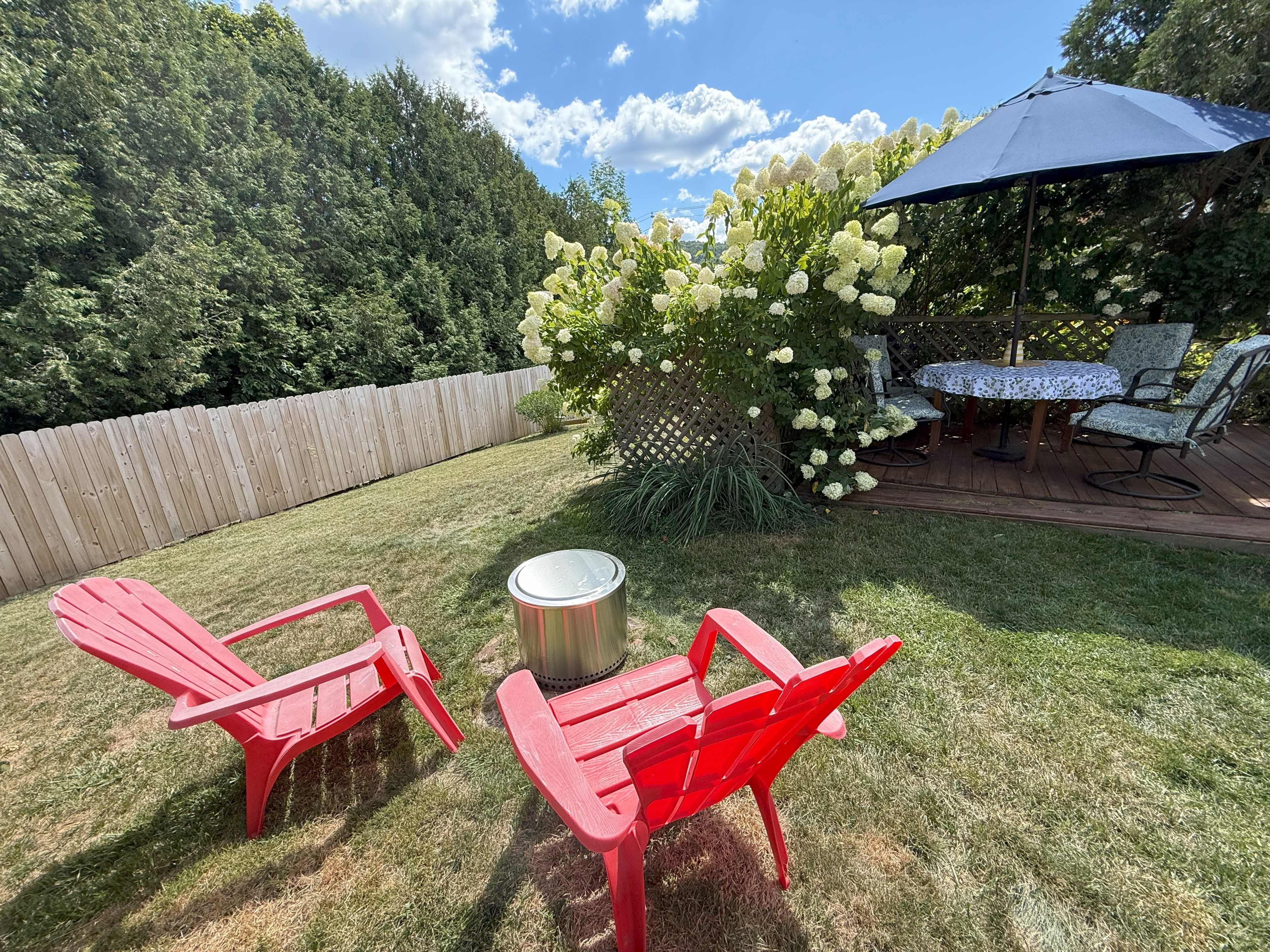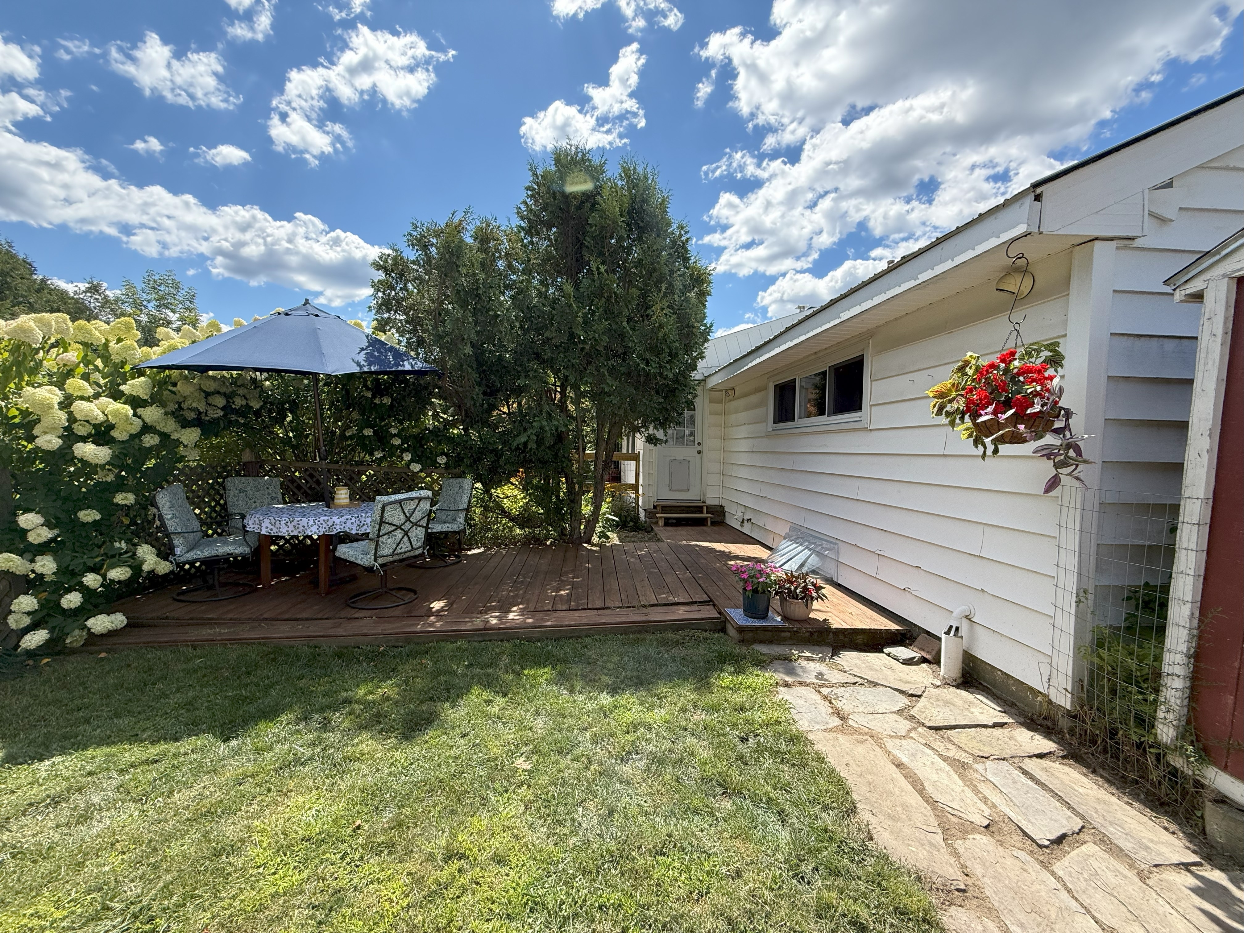 The home sits on a 10,000-square-foot corner lot with beautiful flower gardens, an outdoor deck area, and a fenced in back yard for kids and/or doggos with plenty of privacy.