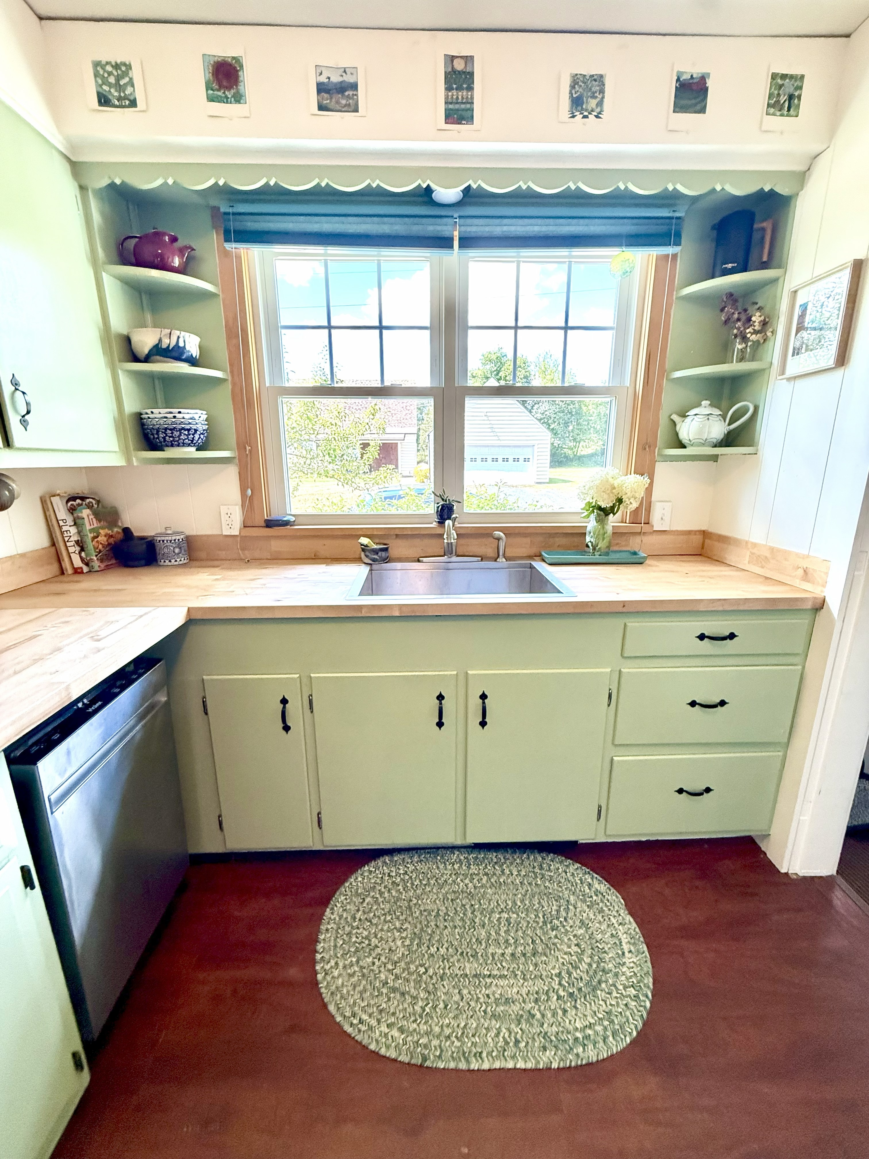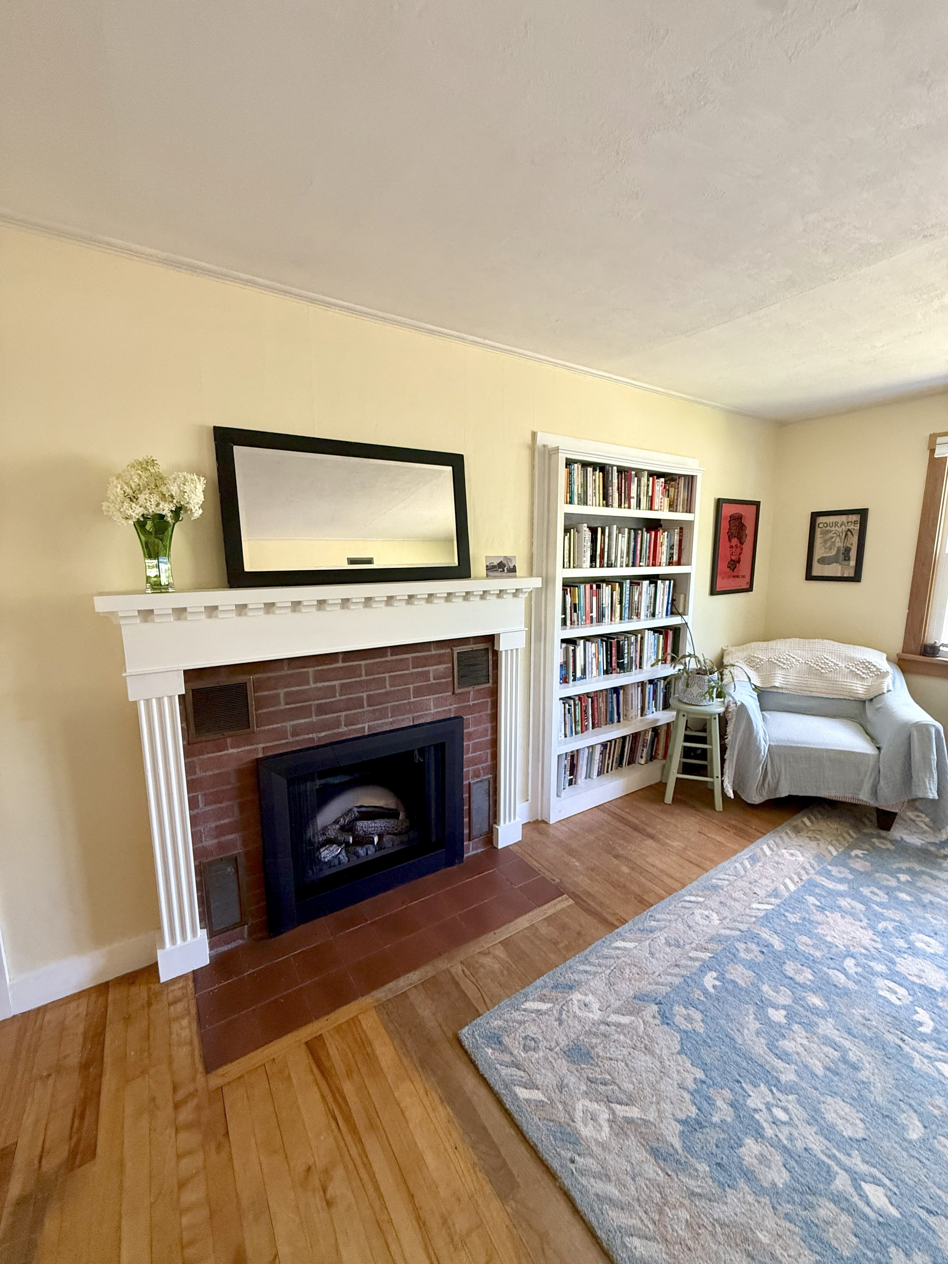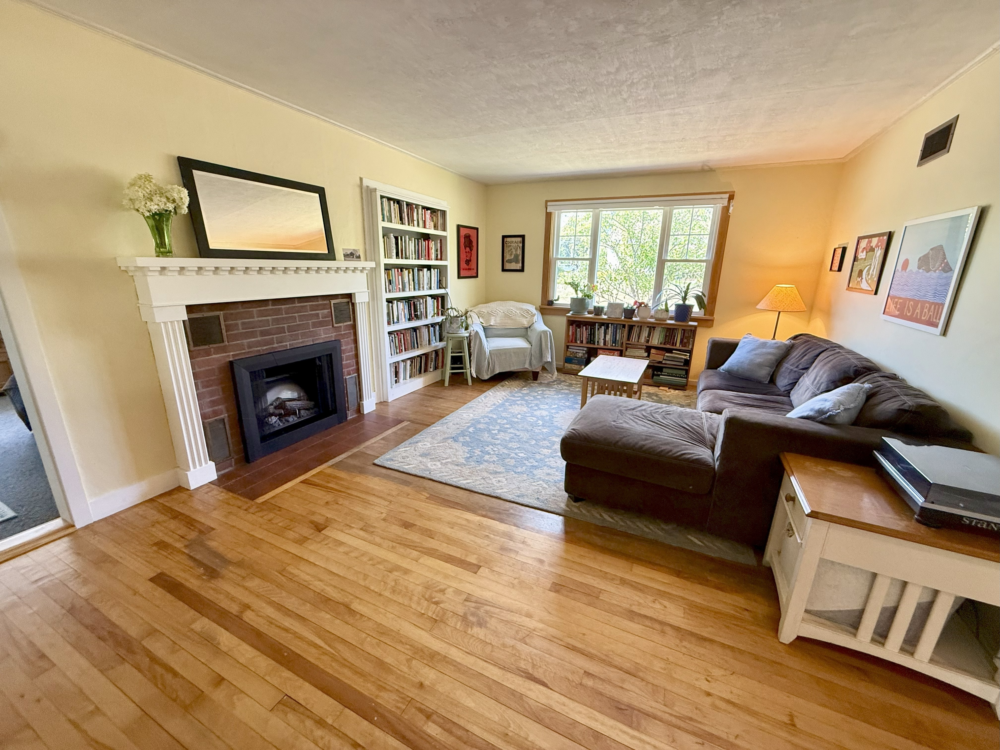 The interior features two spacious bedrooms, an open concept living/dining room area, large windows allowing plenty of natural light, and a custom built-in bookshelf next to the fireplace. The kitchen features maple butcher block countertops, a large stainless-steel sink, and updated dishwasher and refrigerator.