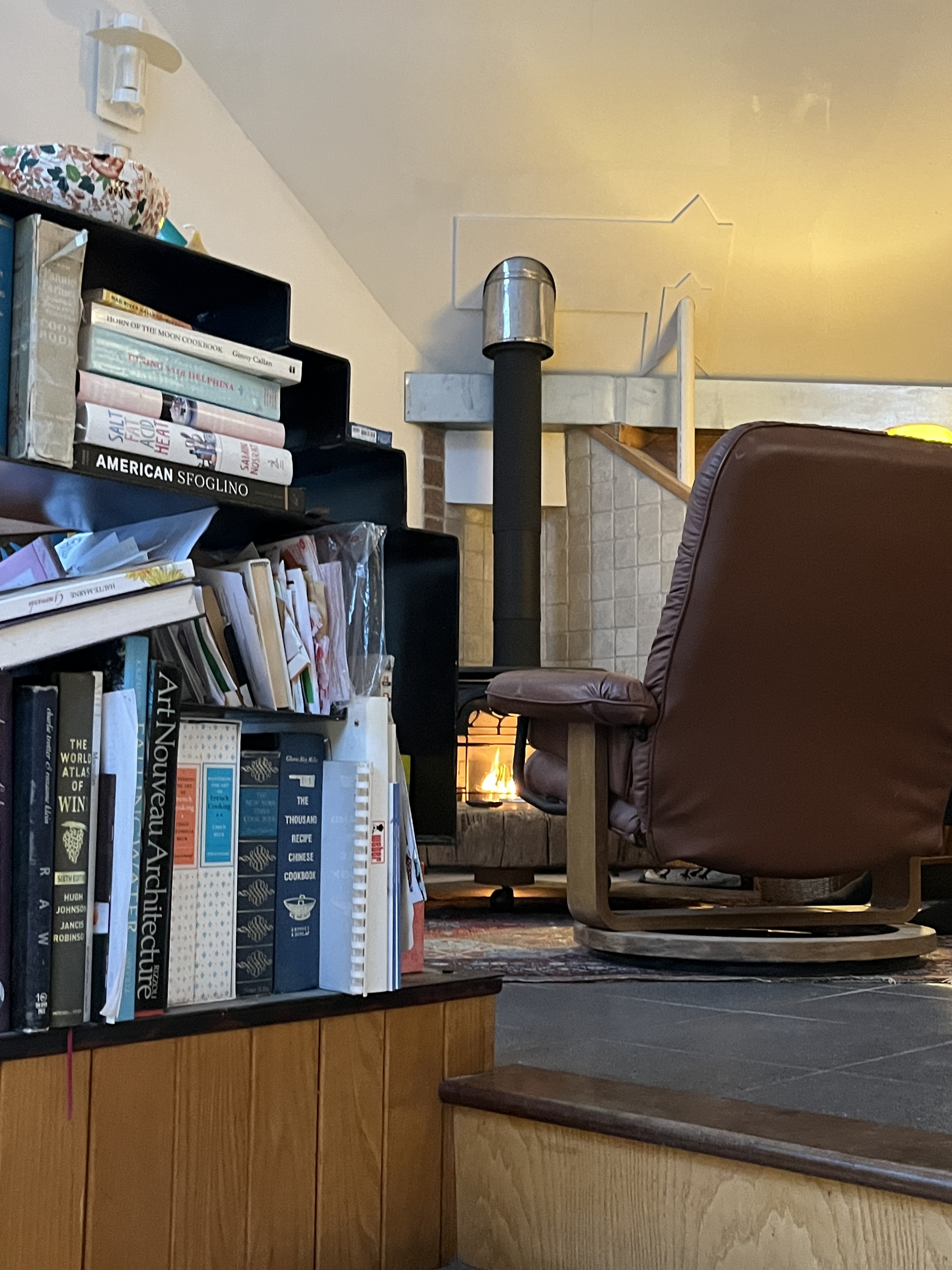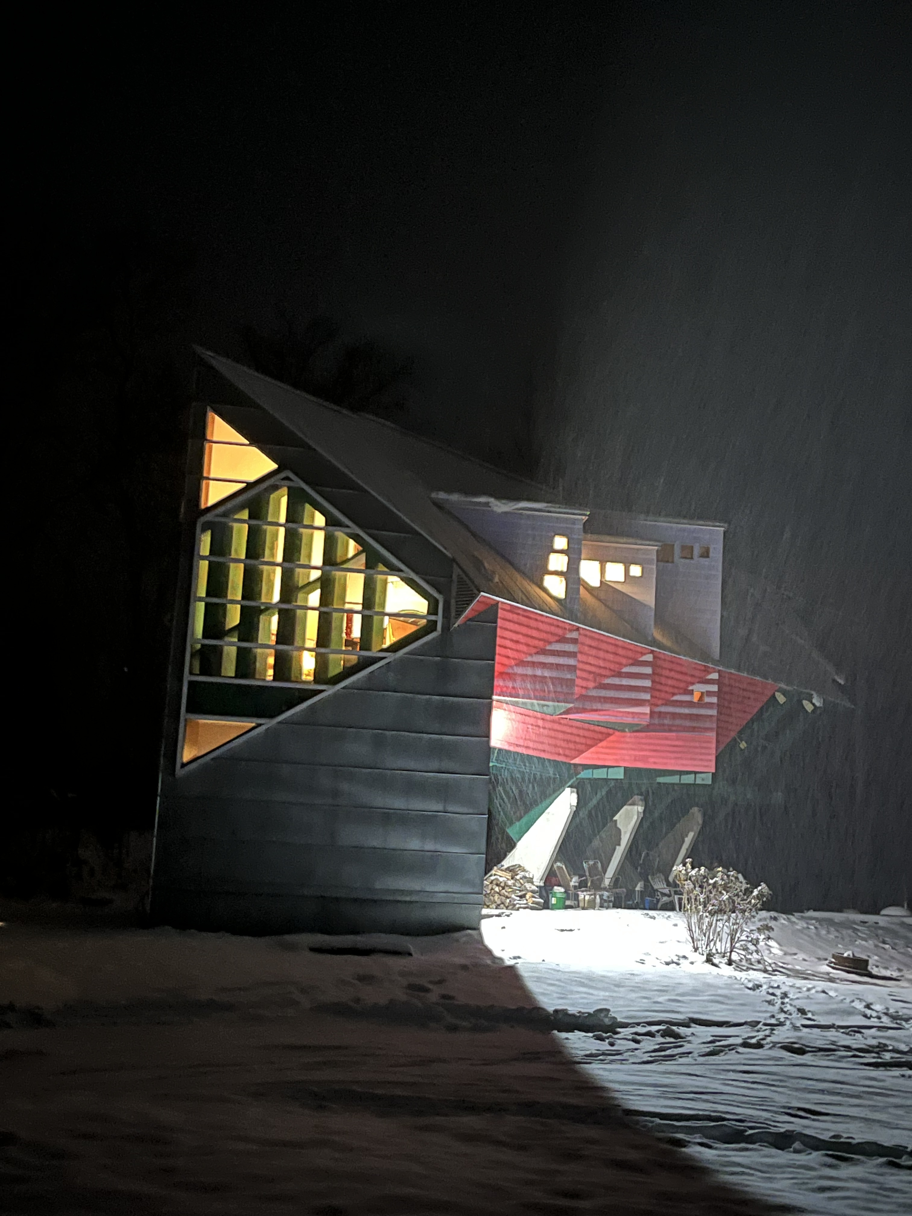 We find ease in living here, small and functional it can sleep up to 6 as a ski house, and as a year round place, it is practical as well as adventurous. Daring originality the students experimented with wood inlays and an innovative variation of a Trombe wall. The house heats easily in winter and cools with just one 10,000 BTU air conditioner.
